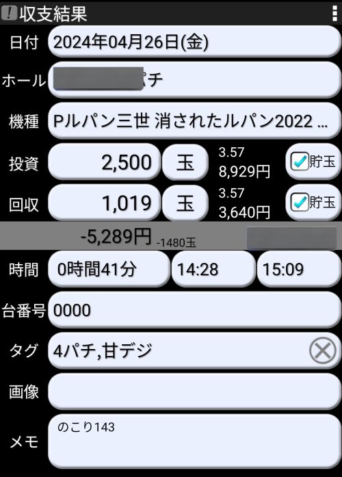 【最も負けた台】-5,289円「Pルパン三世 消されたルパン2022 99ver.」